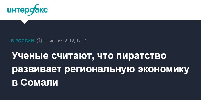 Лондон. 13 января. INTERFAX.RU - Сомалийское пиратство благотворно сказывается на развитии экономики региональных центров государства, сообщили сотрудники британского Королевского института международных отношений в докладе, опубликованном в пятницу.