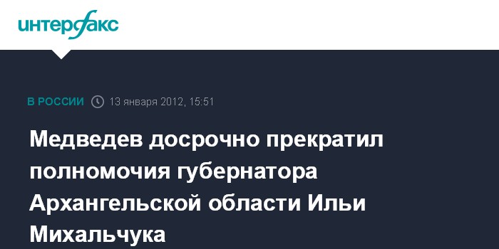Москва. 13 января. INTERFAX.RU - Президент России Дмитрий Медведев подписал Указ "О досрочном прекращении полномочий губернатора Архангельской области", сообщает в пятницу пресс-служба главы государства.