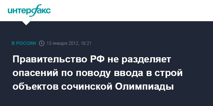 Москва. 13 января. INTERFAX.RU - В правительстве заявляют об отсутствии рисков несвоевременного ввода в строй объектов Олимпиады в Сочи.