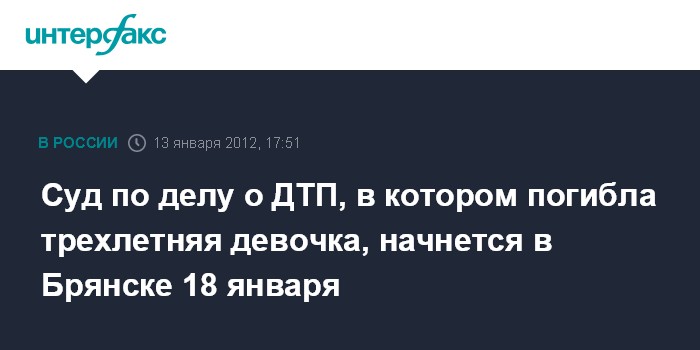 Брянск. 13 января. INTERFAX.RU - Судебный процесс по делу о ДТП в Брянске, в котором погибла трехлетняя Соня Сивакова, начнется 18 января.
