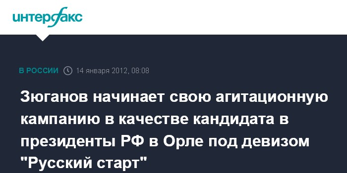 Москва. 14 января. ИНТЕРФАКС - Агитационная кампания кандидата в президенты РФ, лидера КПРФ Геннадия Зюганова стартует в субботу, 14 января.