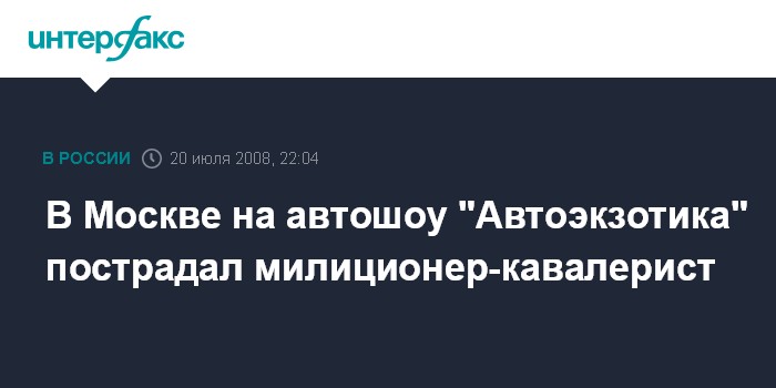 Москва. 20 июля. ИНТЕРФАКС-МОСКВА - На северо-западе Москвы в субботу вечером на автомобильном шоу "Автоэкзотика-2008" в результате раската грома лошадь под милиционером-кавалеристом неожиданно рванулась в сторону и вместе с седоком упала на землю, сообщил "Интерфаксу" источник в правоохранительных органах города в воскресенье.