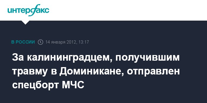 Калининград. 14 января. INTERFAX.RU - В Доминиканскую Республику из Москвы направлен спецборт МЧС, который должен доставить на родину калининградца, пострадавшего во время новогодних каникул, сообщила пресс-служба регионального правительства. Житель Калининграда Михаил Великоселец, отдыхавший с семьёй в Доминикане, получил серьезную травму головы. Его госпитализировали в местную больницу и прооперировали.