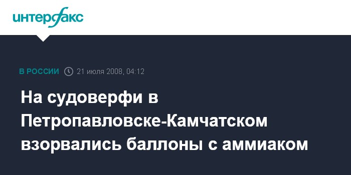 Петропавловск-Камчатский. 21 июля. ИНТЕРФАКС-ДАЛЬНИЙ ВОСТОК - На судоремонтной верфи в порту Петропавловска-Камчатского взорвались два 50-литровых баллона с аммиаком, в результате чего один из сторожей верфи был госпитализирован.