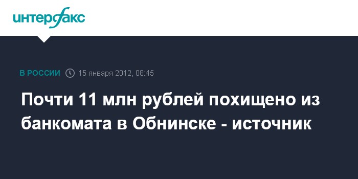 Москва. 15 января. ИНТЕРФАКС - Неизвестные похитили 10 млн 900 тыс. рублей, взломав банкомат в городе Обнинске Калужской области, сообщил "Интерфаксу" в воскресенье источник в правоохранительных органах.