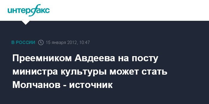 Москва. 15 января. INTERFAX.RU - Наиболее вероятной кандидатурой на пост министра культуры в новом правительстве РФ считается Денис Молчанов, занимающий должность директора правительственного Департамента культуры, заявил "Интерфаксу" информированный источникю "Молчанов - молодой, амбициозный, чиновник новой формации, он уже успел поработать в министерстве заместителем министра", - сказал собеседник "Интерфакса".