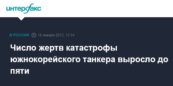Сеул. 15 января. INTERFAX.RU - Количество погибших при крушении южнокорейского нефтяного танкера в Желтом море достигло пяти человек, еще пять человек спасены, сообщают местные СМИ. Ранее сообщалось о трех жертвах.