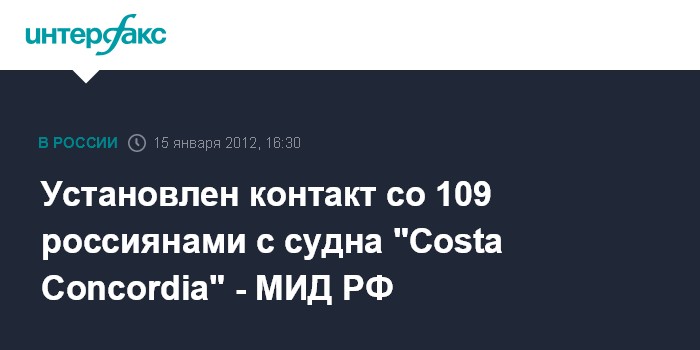 Москва. 15 января. INTERFAX.RU - Российские дипломаты установили связь со 109 гражданами РФ, которые находились на лайнере "Costa Concordia", потерпевшем крушение у берегов Италии, сообщает МИД РФ. "По состоянию на 15.00 мск 15 января посольством установлен контакт с 109 гражданами России", - говорится в сообщении. "Ведется работа по окончательному установлению местонахождения всех российских граждан", - заявляют в МИД РФ.