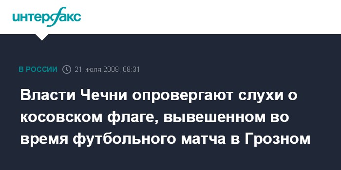 Грозный. 21 июля. INTERFAX.RU - Руководство Чеченской республики категорически опровергает сообщения о том, что во время футбольного матча в Грозном между грозненским "Тереком" и казанским "Рубином" на трибунах якобы был вывешен флаг Косово.