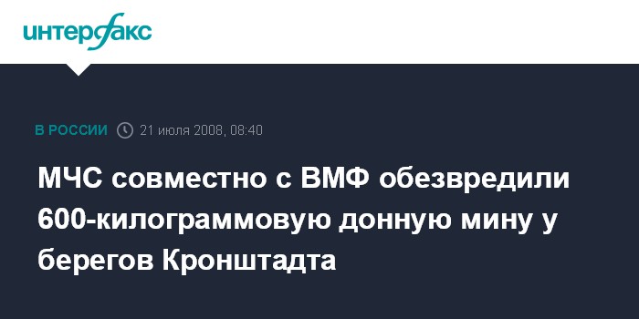 Санкт-Петербург. 21 июля. INTERFAX.RU - Сотрудники МЧС России и специалистамы Военно-морского флота обезвредили донную мину времен Великой Отечественной войны, всплывшую возле форта Константин в Кронштадте, сообщили "Интерфаксу" в главном управлении МЧС по Санкт-Петербургу.
