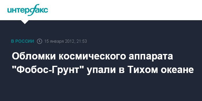 Москва. 15 января. INTERFAX.RU - Фрагменты космического аппарата "Фобос-Грунт", не сгоревшие в плотных слоях атмосферы, предположительно, упали в 21:45 мск в акватории Тихого океана, сообщил "Интерфаксу-АВН" официальный представитель Управления пресс-службы и информации Минобороны РФ по Войскам воздушно-космической обороны полковник Алексей Золотухин.