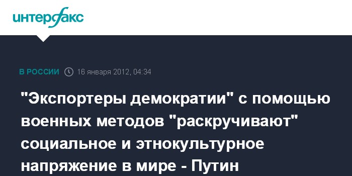 Москва. 16 января. ИНТЕРФАКС - Премьер-министр России Владимир Путин заявил, что зачастую союзниками деструктивных сил, "раскручивающих" социальное и этнокультурное напряжение в мире, становятся государства, пытающиеся "экспортировать демократию" с помощью военных методов.