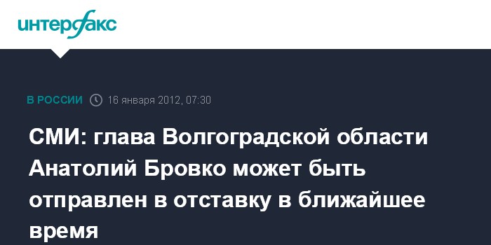 Москва. 16 января. INTERFAX.RU - Вслед за уволенным губернатором Архангельской области Ильей Михальчуком в отставку президент может отправить руководителя Волгоградской области Анатолия Бровко, пишет в понедельник газета "Известия".