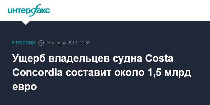 Рим. 16 января. ИНТЕРФАКС - Владелец затонувшего судна Costa Concordia компания Costa Crociere понесет ущерб примерно в 1,5 млрд евро, сообщило в понедельник итальянское телевидение.