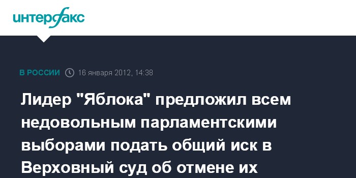 Москва. 16 января. INTERFAX.RU - Лидер партии "Яблоко" Сергей Митрохин призвал все парламентские политические партии объединиться и подать иск в Верховный суд РФ с целью отмены результатов выборов в Госдуму, которые прошли 4 декабря 2011 года.