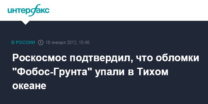Москва. 16 января. INTERFAX.RU - Роскосмос официально подтвердил факт падения космического аппарата "Фобос-Грунт" в Тихом океане.