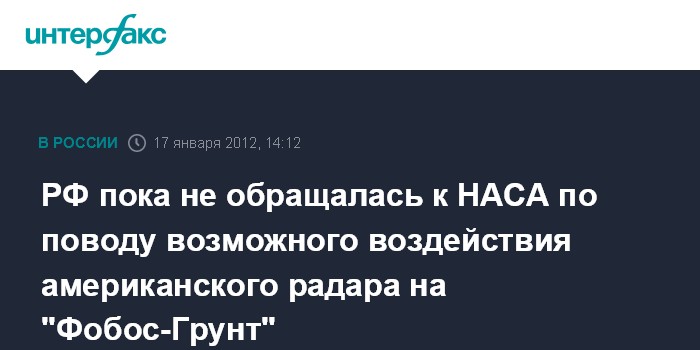 Москва. 17 января. INTERFAX.RU - В российское представительство НАСА не поступал официальный запрос со стороны комиссии по расследованию причин аварии космического аппарата "Фобос-Грунт" о возможном влиянии американского радара на аппарат.