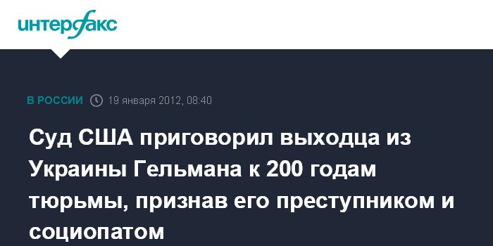 Лондон. 19 января. INTERFAX.RI- Выходца из Украины Максима Гельмана приговорили в США к 200 годам за убийства нескольких человек, сообщает британская телерадиовещательная корпорация Би-би-си.