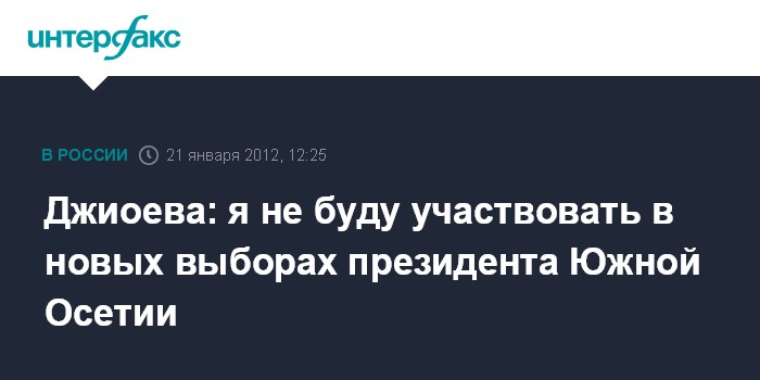 Цхинвал. 21 января. INTERFAX.RU - Лидер оппозиции, экс-кандидат в президенты Южной Осетии Алла Джиоева заявила, что не будет принимать участие в назначенных на 25 марта новых выборах главы республики. "Я не признаю выборы 25 марта 2012 года и не намерена в них участвовать", - сказала она в субботу "Интерфаксу"