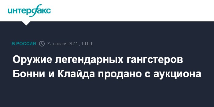 Лондон. 22 января. INTERFAX.RU - Оружие, некогда принадлежавшее американским бандитам-любовникам Бонни Паркер и Клайду Бэрроу, продано на аукционе в Канзас-Сити за $210 тысяч. Как передает Би-би-си, обладателем автомата Томпсона и дробовика системы "Винчестер" стал покупатель, не пожелавший раскрыть свое имя.