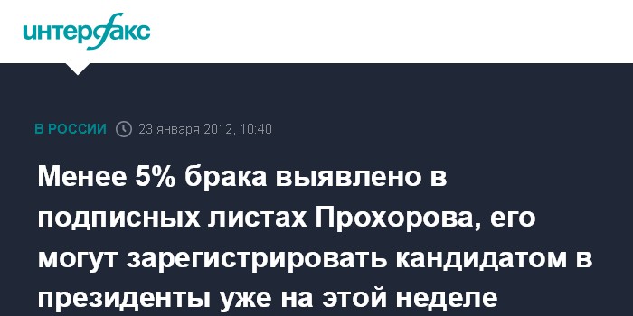 Москва. 23 января. INTERFAX.RU - Уровень брака в подписных листах, представленных предпринимателем Михаилом Прохоровым, чуть ниже 5%, что позволит зарегистрировать его в качестве кандидата в президенты РФ в ближайшие дни, сообщил источник в ЦИК РФ.