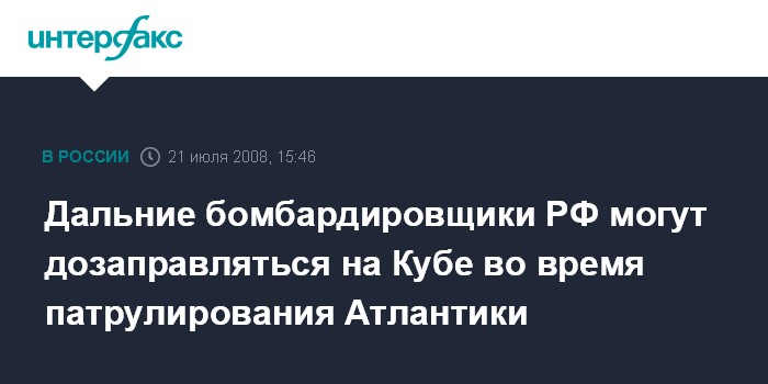 Москва. 21 июля. INTERFAX.RU - Российские стратегические бомбардировщики могут использовать аэродром на Кубе для дозаправки во время полетов на воздушное патрулирование в Атлантике, заявил "Интерфаксу-АВН" информированный военно-дипломатический источник в Москве.