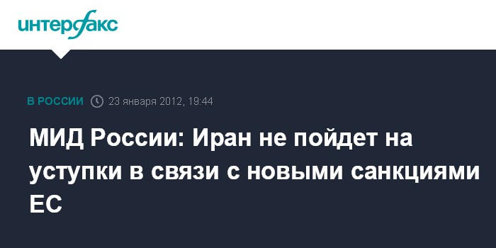 Москва. 23 января. INTERFAX.RU - В Москве с сожалением и тревогой восприняли известие о введении Евросоюзом нового пакета односторонних санкций в отношении Исламской Республики Иран (ИРИ), заявляют в МИД РФ.