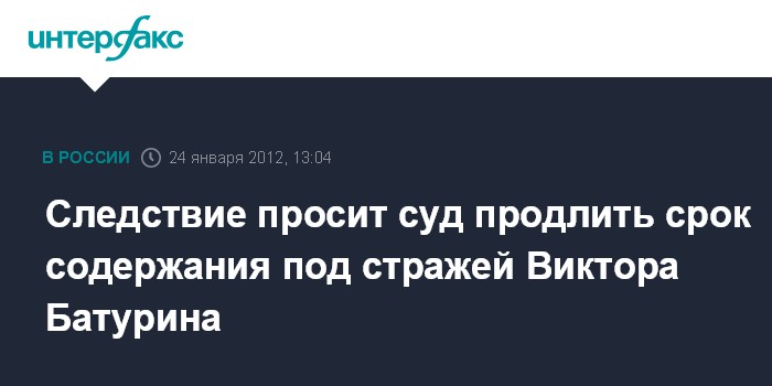 Москва. 24 января. INTERFAX.RU - Следствие ходатайствует о продлении срока ареста предпринимателя Виктора Батурина, сообщили "Интерфаксу" в пресс-службе ГУ МВД России по Москве.