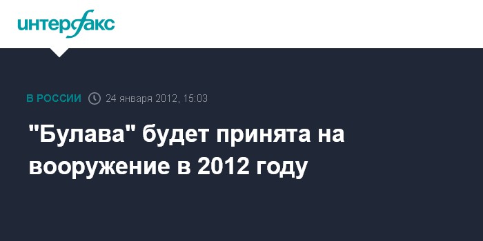Москва. 24 января. INTERFAX.RU - Стратегический ракетный комплекс морского базирования "Булава" успешно завершил испытания и будет принят на вооружение Военно-морского флота, сообщил во вторник журналистам первый заместитель министра обороны РФ Александр Сухоруков.