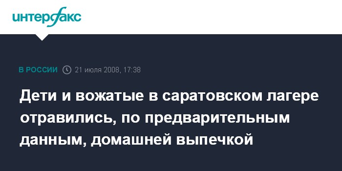 Москва. 21 июля. INTERFAX.RU - В Саратове госпитализированы 13 человек, отравившихся в детском городском оздоровительном лагере "Молодежный".