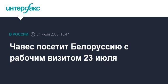 Москва. 21 июля. INTERFAX.RU - Президент Венесуэлы Уго Чавес 23 июля посетит Белоруссию с рабочим визитом, сообщили агентству "Интерфакс-Запад" в понедельник в пресс-службе МИД республики.