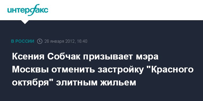 Москва. 26 января. INTERFAX.RU - Известная телеведущая Ксения Собчак обратилась к мэру Москвы Сергею Собянину и компании-застройщику с просьбой не строить элитное жилье на территории фабрики "Красный Октябрь". "Красный октябрь" рискует превратиться в очередной комплекс элитного жилья вместо того, чтобы оставаться центром притяжения для "креативного класса". Сокращение со 180 тыс. м2, как планировалось до этого, до 25 тыс. м2 застройки принципиально никак не изменит эту ситуацию", - пишет Собчак в обращении, размещенном в ее блоге в Живом журнале.