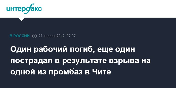Чита. 27 января. ИНТЕРФАКС-СИБИРЬ - На одной из промбаз Читы вечером в четверг произошел взрыв неустановленного предмета, в результате чего пострадали двое рабочих, один из которых позже скончался, сообщает в пятницу пресс-служба краевого управления СКР.