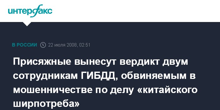 Москва. 22 июля. ИНТЕРФАКС - Коллегия присяжных в Мосгорсуде во вторник, как ожидается, вынесет вердикт в отношении двух сотрудников ГИБДД - Сергея Богородицкого и Дмитрия Гончаренко, обвиняемых в мошенничестве и взяточничестве по "делу китайского ширпотреба".