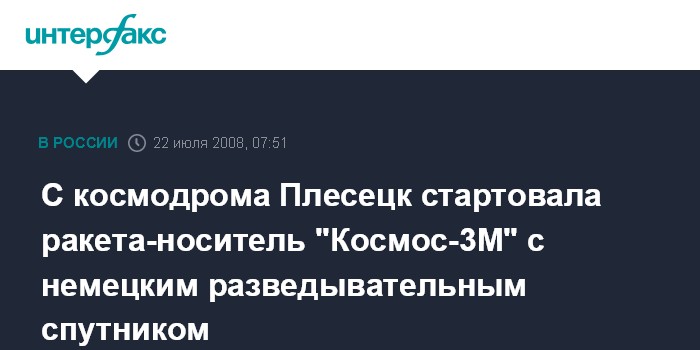 Москва. 22 июля. ИНТЕРФАКС-АВН - Ракета космического назначения "Космос-3М" с немецким спутником радиолокационной разведки "САР-Лупе" " (SAR-Lupe) стартовала с космодрома Плесецк (Архангельская область), сообщил "Интерфаксу-АВН" во вторник начальник службы информации и общественных связей Космических войск Алексей Золотухин.