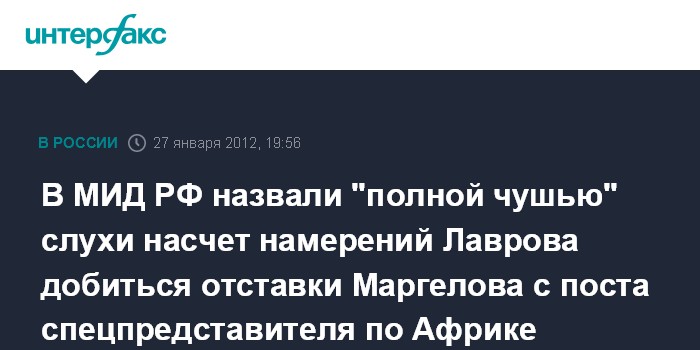 Москва. 27 января. INTERFAX.RU - Сообщения СМИ о том, что министр иностранных дел России Сергей Лавров якобы обратился к руководству страны с обоснованием необходимости отставки Михаила Маргелова с поста спецпредставителя президента РФ по сотрудничеству со странами Африки, не соответствуют действительности, заявил официальный представитель МИД РФ Александр Лукашевич.