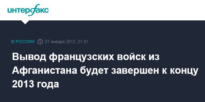 Париж. 27 января. INTERFAX.RU - Французские войска будут выведены из Афганистана к концу 2013 года, сообщил в пятницу президент Франции Николя Саркози после встречи с афганским коллегой Хамидом Карзаем в Париже, передает агентство ЭФЭ.