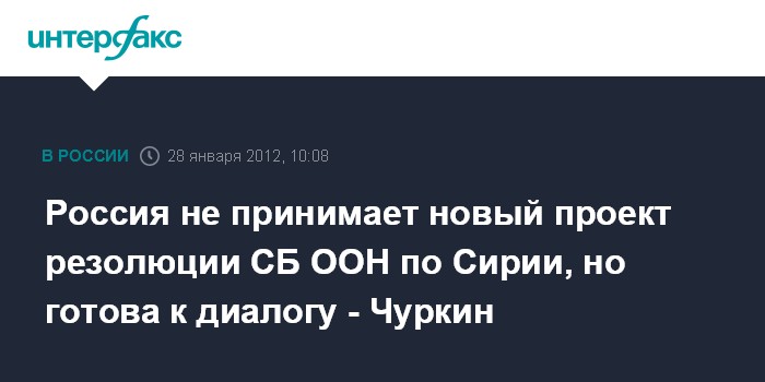 Нью-Йорк (ООН). 28 января. INTERFAX.RU - Россия не готова принять условия предложенного Марокко проекта резолюции Совета Безопасности ООН по Сирии, однако согласна продолжать переговоры по данному вопросу, сообщил в субботу постоянный представитель России при ООН Виталий Чуркин. "Россия не считает, что данный проект резолюции может послужить основой для выхода из кризиса, однако мы готовы обсуждать этот вопрос дальше", - сказал В.Чуркин в беседе с журналистами по итогам закрытого заседания Совбеза ООН.