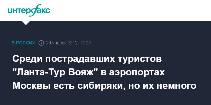 Новосибирск. 28 января. INTERFAX.RU - Жителей сибирских регионов среди туристов, которые не смогли вылететь из "Шереметьево" и "Домодедово" в связи с финансовыми проблемами туроператора "Ланта-Тур Вояж", может быть небольшое количество, сообщила агентству "Интерфакс-Сибирь" председатель правления регионального отраслевого союза туриндустрии Сибири Наталья Куцевол.