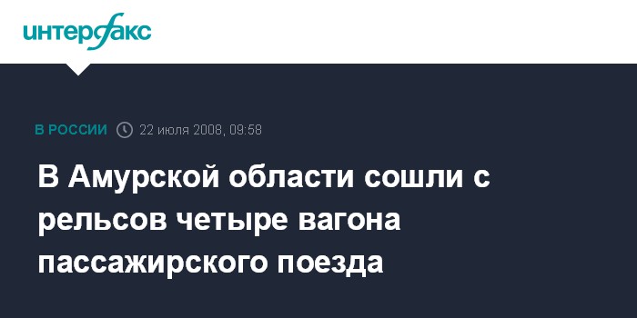 Хабаровск. 22 июля. ИНТЕРФАКС - ДАЛЬНИЙ ВОСТОК - В районе поселка Магдагачи Амурской области во вторник в 14:20 по местному времени (07:20 мск) сошли с рельсов четыре вагона пассажирского поезда Хабаровск - Нерюнгри (Якутия), сообщили агентству "Интерфакс - Дальний Восток" в пресс-службе Дальневосточного регионального центра МЧС РФ во вторник.
