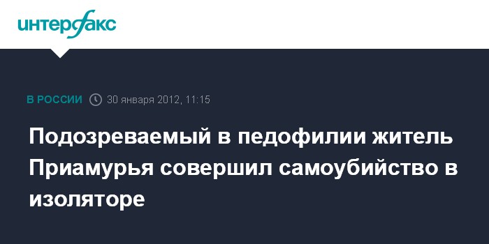 Москва. 30 января. INTERFAX.RU - Подозревавшийся в развратных действиях в отношении малолетних 24-летний житель села Тамбовки, покончил с собой в ночь на понедельник в изоляторе временного содержания села Ивановки Амурской области, сообщает Следственный комитет РФ.