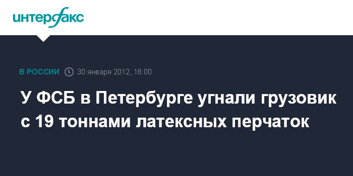 Санкт-Петербург. 30 января. INTERFAX.RU - Автомобиль с грузом автотранспортного предприятия (АТУ) ФСБ России из 19 тонн латексных перчаток угнан в Петербурге, сообщил "Интерфаксу" источник в правоохранительных органах в понедельник