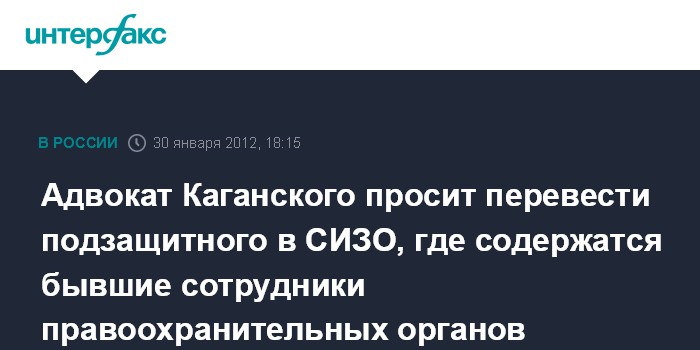 "Три дня назад Каганского перевели в пятый изолятор, где нет категории "бывший сотрудник". В администрации СИЗО нам сообщили, что раньше к ним бывших сотрудников правоохранительных органов не переводили. Опасаясь за его безопасность, администрации пришлось поместить Каганского в одиночную камеру", - рассказал "Интерфаксу" в понедельник адвокат Владимир Жеребенков, представляющий интересы М.Каганского.