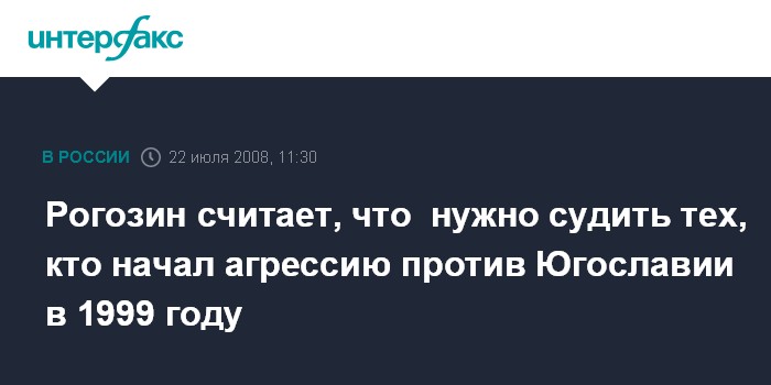 Москва. 22 июля. INTERFAX.RU - Постпред России при НАТО Дмитрий Рогозин заявил, что в случае начала судебного процесса над бывшим лидером боснийских сербов Родованом Караджичем необходимо привлечь к ответственности и инициаторов агрессии 1999 г. против бывшей Югославии.