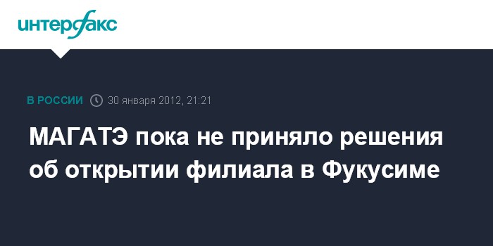 Москва. 30 января. ИНТЕРФАКС - Международное агентство по атомной энергии (МАГАТЭ) получило запрос из Японии на открытие филиала в префектуре Фукусима, однако еще не приняло решения о его открытии.