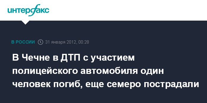Ростов-на-Дону. 31 января. ИНТЕРФАКС-ЮГ - В Чечне в результате ДТП с участием легкового автомобиля ВАЗ-21010 и бронированного полицейского автомобиля погиб водитель "Жигулей", а семеро полицейских получили травмы, сообщили во вторник агентству "Интерфакс-Юг" в правоохранительных органах.