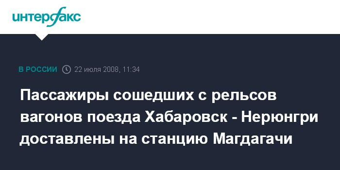 Москва. 22 июля. INTERFAX.RU - В трех сошедших с рельсов вагонов пассажирского поезда № 325 Хабаровск - Нерюнгри, находилось 29 человек, в том числе трое детей.