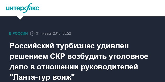Москва. 31 января. ИНТЕРФАКС - Представители российского турбизнеса крайне удивлены решением СКР возбудить уголовное дело в отношении руководителей "Ланта-тур вояж" и считают его скоропалительным.