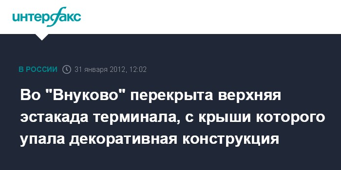 Москва. 31 января. INTERFAX.RU - В аэропорту "Внуково" временно перекрыто движение по терминалу "А", с эстакады которого упала часть декоративной конструкции.