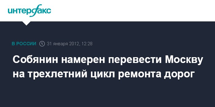 Москва. 31 января. INTERFAX.RU - В условиях запредельной транспортной нагрузки ремонт дорог в Москве надо проводить чаще, чем в других регионах России, считает мэр Сергей Собянин.